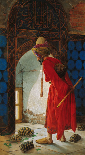 “Turtle Trainer” is Osman Hamdi’s most interesting and unique piece. Within a very simple composition, each element is a symbol for an ironic story. The turtles in the painting are slow, cumbersome and just in search for food representing Osman Hamdi’s co workers who were resisting Osman Hamdi’s innovative ideas. He painted his own as the trainer with his Ney (Flute) hang at his back. He wants to train the turtles by blowing it, but the turtles cannot hear him because they don’t have ears.
